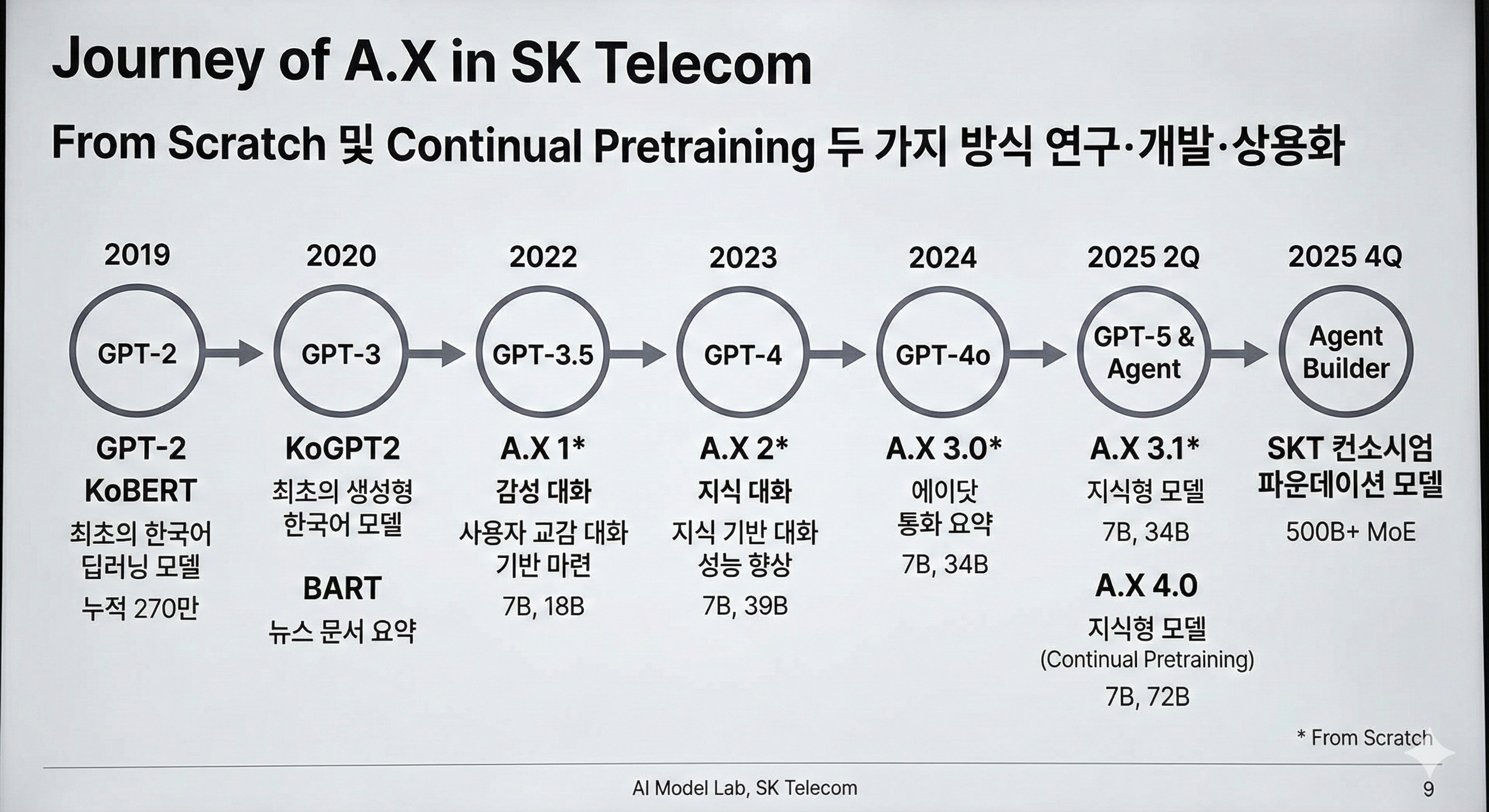 (SK 텔레콤의 AX 개발 이력인데 촬영한 이미지가 조금 깨져서 Gemini로 다듬었습니당)