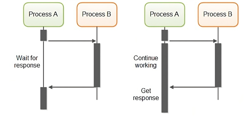 아래 이미지를 살펴보자. 좌측은 호출 함수에 제어권을 넘기고 기존 함수의 동작을 중단하는 Blocking 방식이다. 우측은 호출 함수에 제어권을 넘기지 않고 기존 함수를 계속 동작하는 Non-blocking 방식이다.