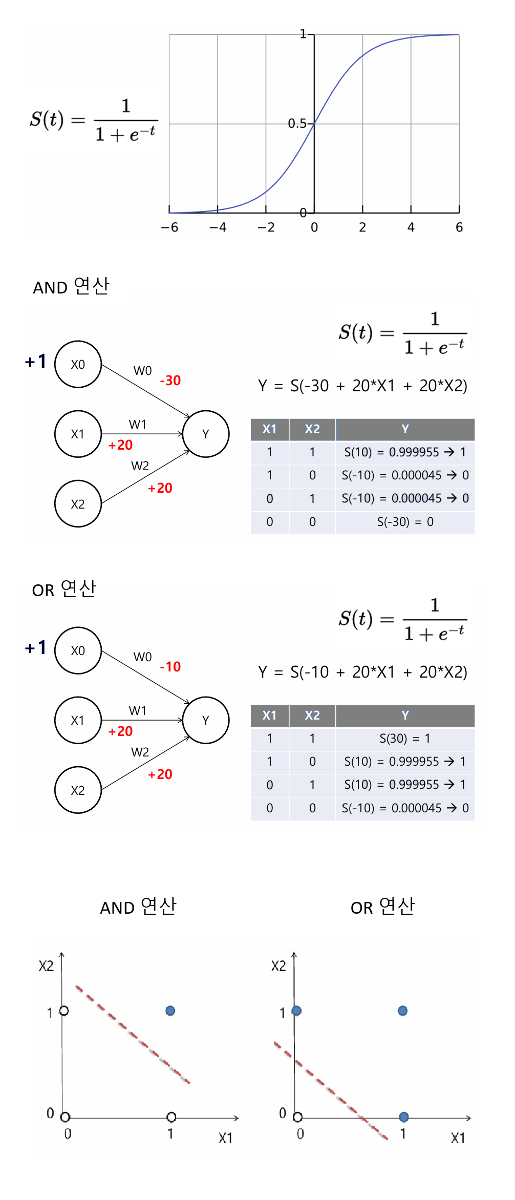 연산에서 사용되는 공식 Y = S(W0 * X0 + W1 * X1 + W2 * X2)에서 Y는 자극이 있다 없다를 표시하는 1 또는 0이고, W는 가중치, S는 시그모이드 함수를 의미해요. 즉, 가중치 값만으로 AND 연산이 되고 OR 연산이 되는 것이죠. 또한 가중치 값이 AND, OR 연산에서 직선의 방정식을 결정합니다. 이때 가중치 값은 무한대로 설정할 수 있어요.