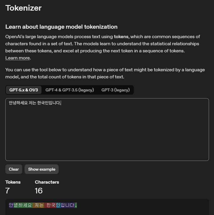 다양한 Tokenizer 사이트에서 입력한 텍스트의 토큰을 확인할 수 있습니다. 저는 https://platform.openai.com/tokenizer를 사용했습니다.