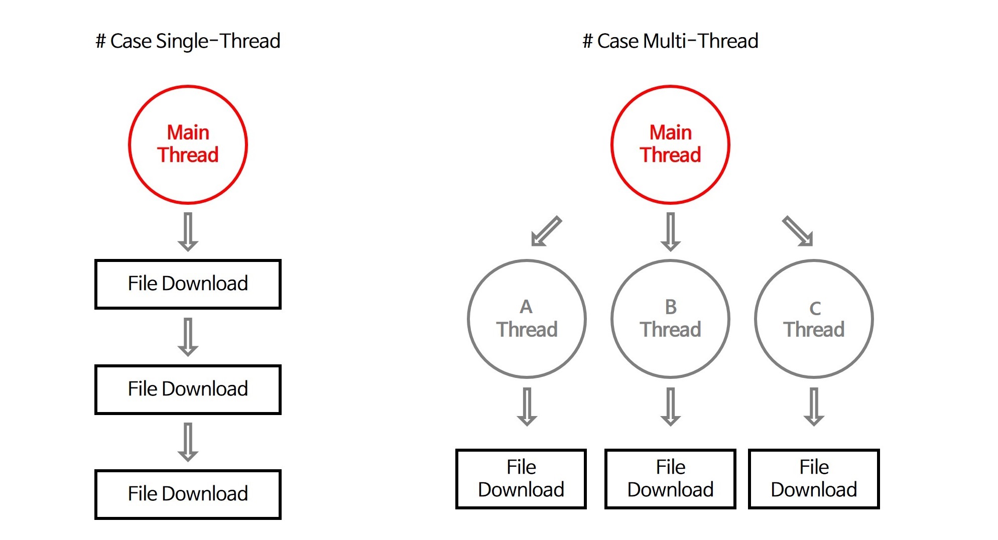 싱글 스레드의 경우, 한 번에 하나의 파일만을 순차적으로 다운로드해야 한다. 멀티 스레드의 경우, 여러 파일을 동시에 각각의 스레드에서 다운로드할 수 있다.