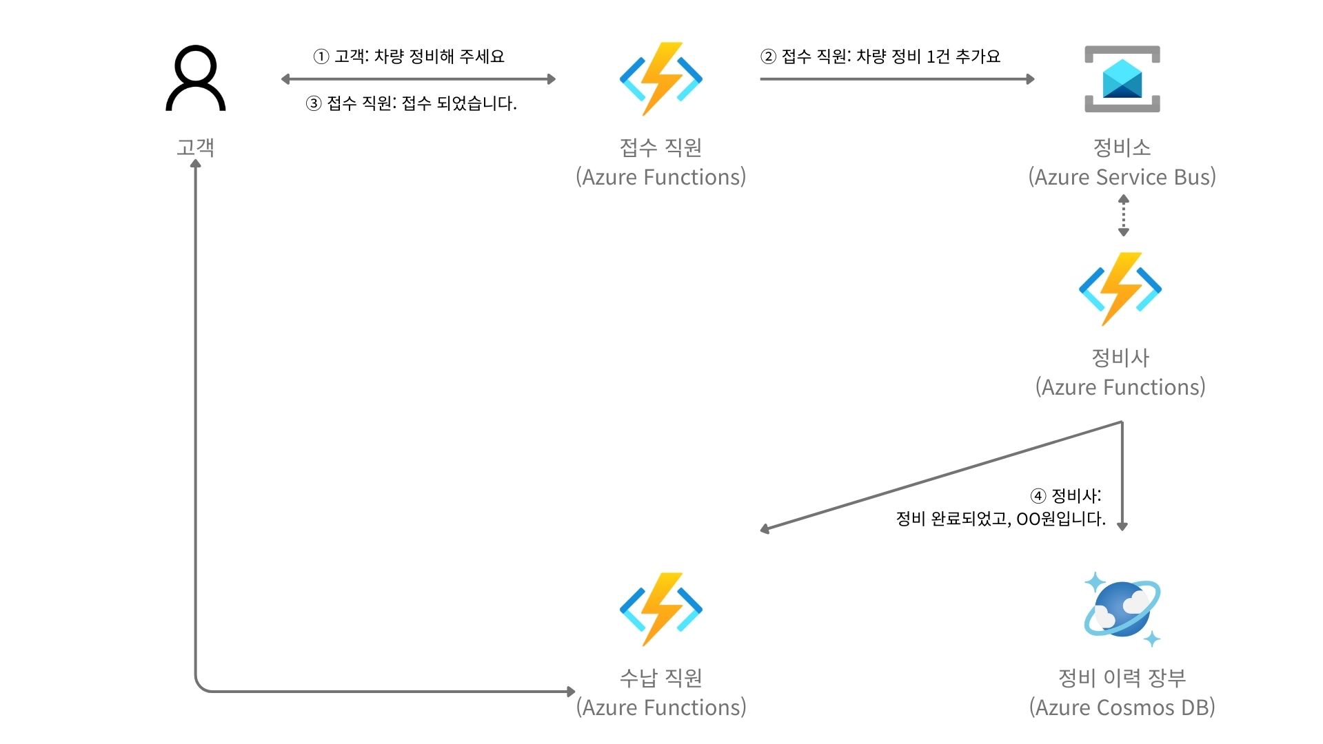 반면 서버리스 아키텍처는 위 이미지와 같이 기능을 처리하는 주체(접수 직원, 정비사, 수납 직원, 정비 이력 장부) 단위로 서비스를 분산할 수 있다.